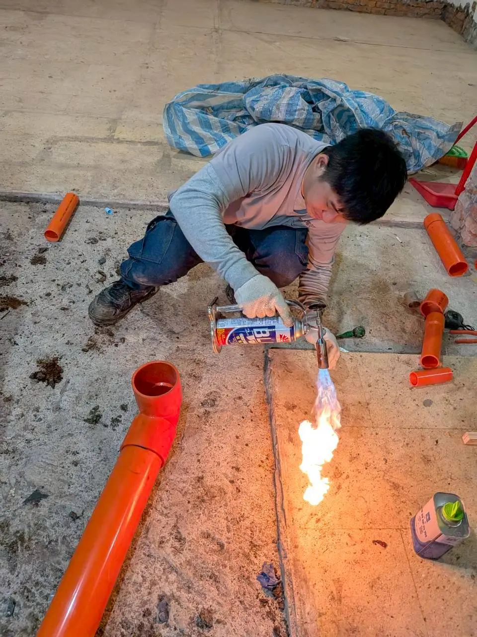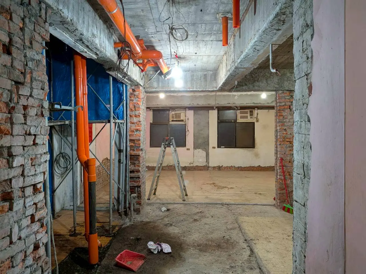 到場後,由於管線貫穿多個樓層,師傅先於戶外搭設施工架,並沿著原有管道間將局部紅磚牆面打除,小心拆卸並清運所有老舊的塑膠管。確認管道空間與樓板結構無礙後,隨即進入管線更新階段。為了讓新排水系統更好維護,現場全面換用管壁更厚、耐候且抗壓性更佳的「橘色PVC管」重新配置。