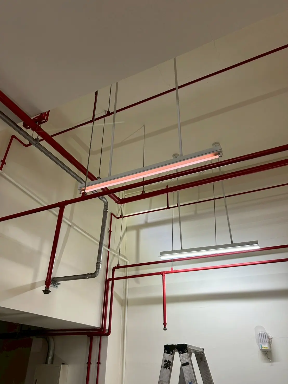 施工內容包含舊有燈管拆除、燈具支架更新、電線管路整理與防潮配線重拉。新設燈具採用高亮度 LED 防水防塵型燈管,具備長壽命與低耗能特性,可有效降低維護成本與耗電量。為提升使用效率,並依實際區域需求重新規劃照明迴路,使燈具分區控制更靈活,同時加裝節能型開關模組,減少長時間全區照明造成的能源浪費。
