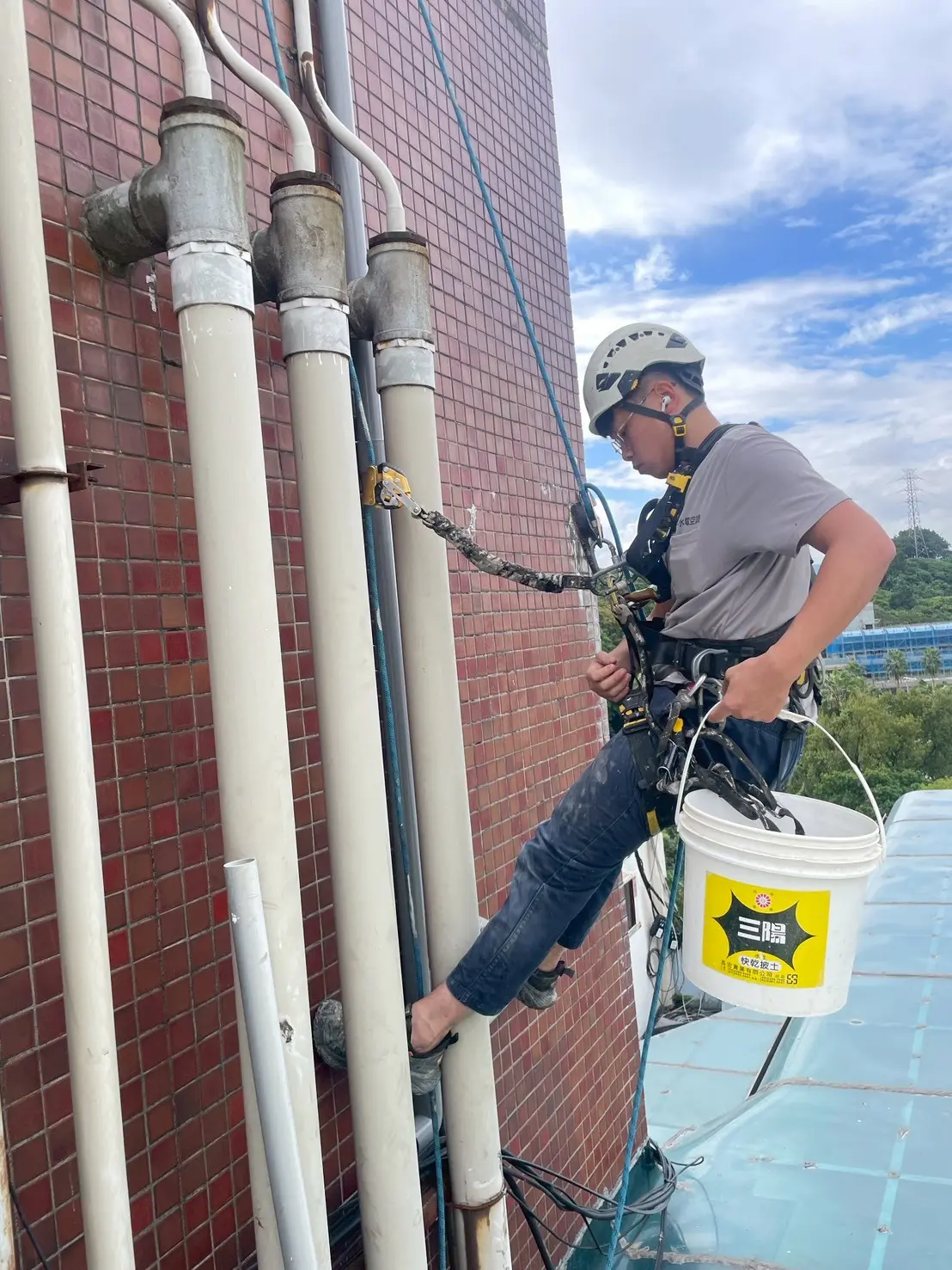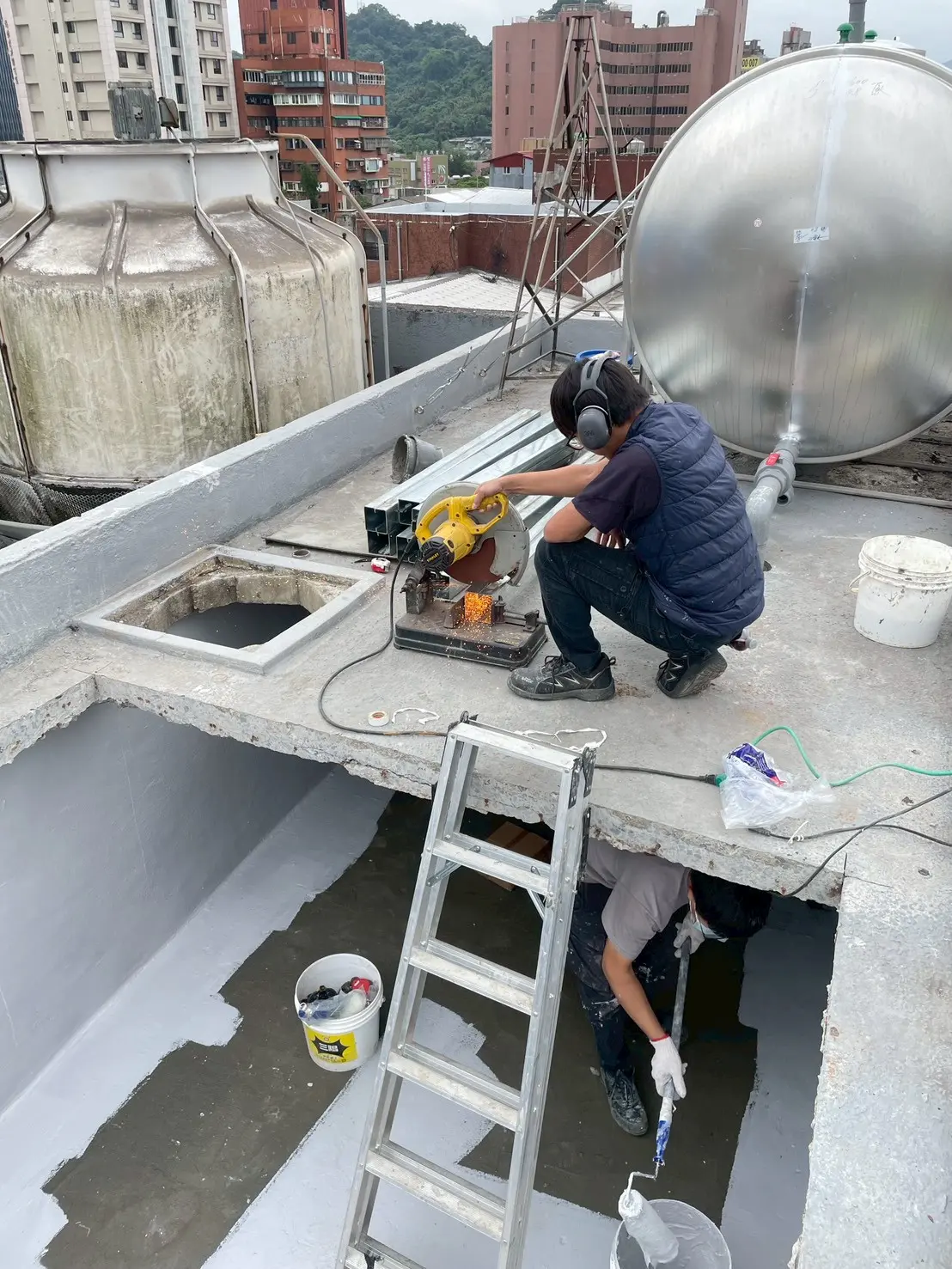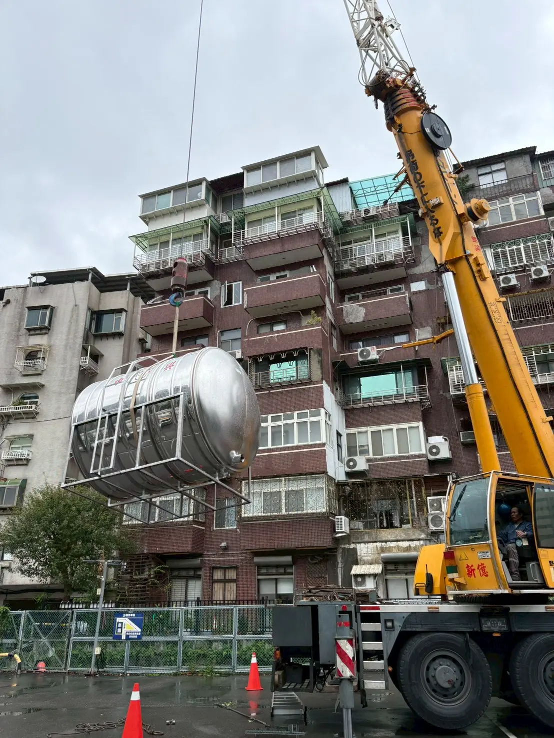 Performance 水塔更新與配管工程 工程地點 台北市大樓管理委員會 工程說明 大樓原有的水塔使用多年,內部鏽蝕與沉積物明顯變多,供水效率不穩定。加上頂樓管線老舊、部分接頭滲水,因此管委會決定同步更新水塔並調整配管,避免後續供水中斷或造成二次漏水問題。 首先,協助規劃新水塔尺寸與吊掛動線,並安排大型吊車進場作業。在吊運水塔前,現場先將舊管件拆除、重新整理頂樓平台,接著依照設計管路重新安裝主幹管與進出水管,包含補強固定點、調整坡度與進行必要的密封施工。新水塔定位後,再進行完整的供水測試與滲漏檢查,確認水塔與管線都能穩定運作。 水塔屬於建築供水系統的重要設備,使用多年後容易出現鏽蝕、淤積或接頭老化,建議定期檢查水質、接頭與平台結構,若有疑似滲漏或供水量下降的狀況,應早點更新或維修,才能避免更大的損害。